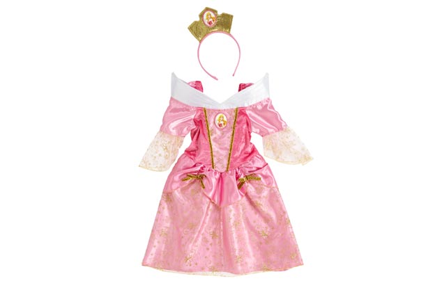 We love this classic Sleeping Beauty princess dress, it's covered in gold detailing and comes with a matching gold crown.