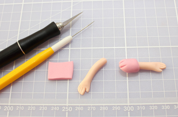 For the arms: Using 5g of skin tone paste, roll a long thin sausage shape for the arms and cut diagonally in half.