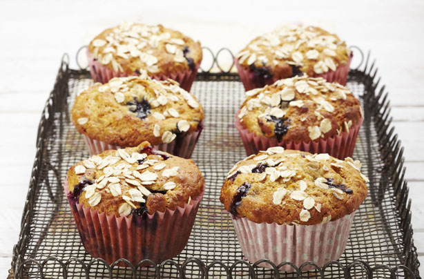 - Set the oven to gas mark 4 or 180°C. Sieve the white and brown flours into a bowl, tipping in the bran left in the sieve. Add the bicarbonate of soda, baking powder, oats and sugar. Gently stir the dry ingredients together and sprinkle in the blueberries.