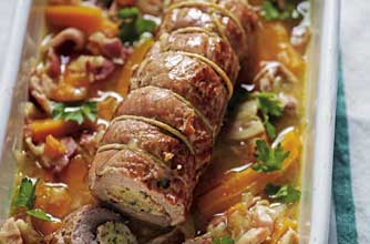 - Heat a fairly deep frying pan, add oil and brown pork all over for about 6 mins. Take meat out and put onion, carrot and bacon into the pan. Fry for 5 mins to brown the veg a little, then put the pork fillet on top, pour over the stock, cover and simmer for 45-50 mins until meat and veg are tender. Leave for 5 minutes before removing string, slice meat and serve.