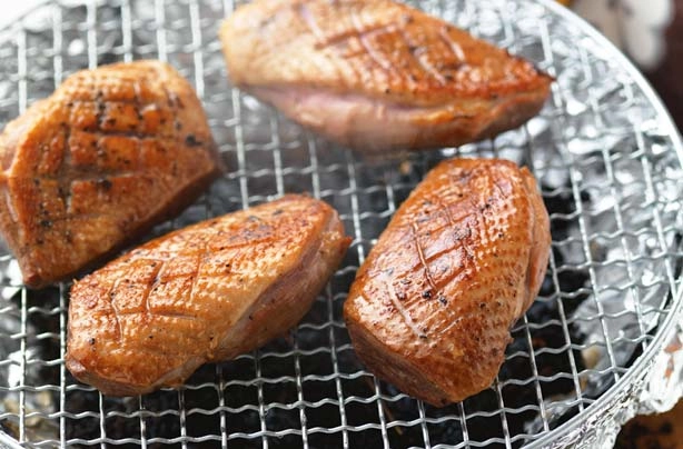 - Score the skin of the duck breasts, season them and put on the rack, skin-side up. Cover and smoke for 20 mins.