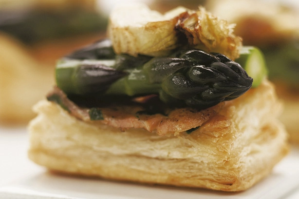 - Slice the artichokes finely and fry in the oil until crisp. Heat a heavy-based frying pan and sear the salmon for 30 secs on each side. Place a slice of the salmon, then 2-3 asparagus tips, then an artichoke slice into the tartlet and serve.